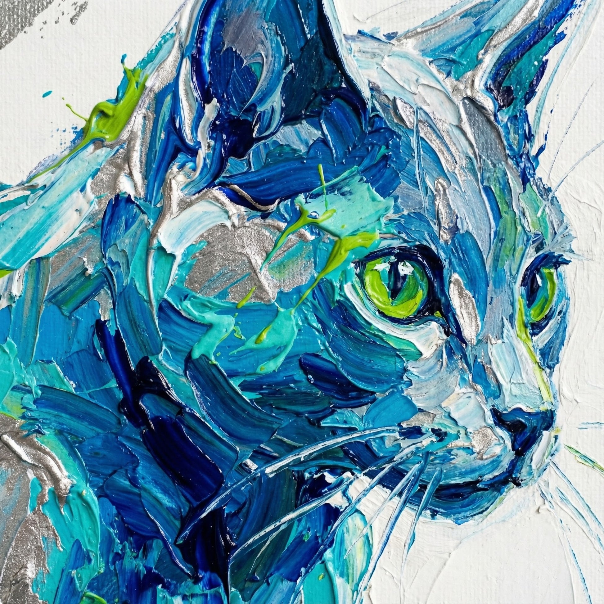 This canvas features a dynamic, painterly composition built from bold brushstrokes and layered color. The subject feels in motion, with expressive strokes and directional energy that create depth and momentum across the surface. Cool blues and greens dominate the palette, balanced with sharp highlights that keep the image crisp rather than chaotic.