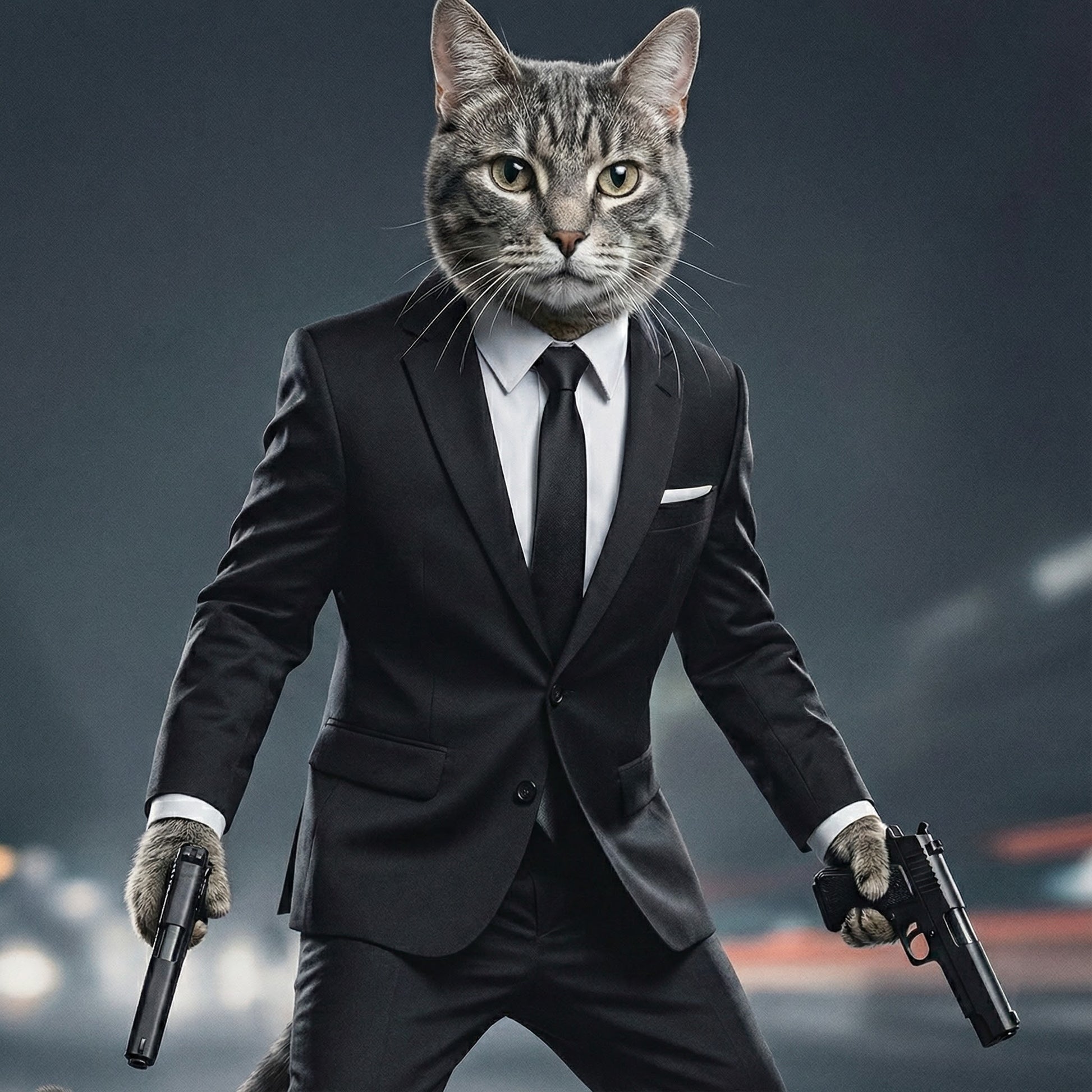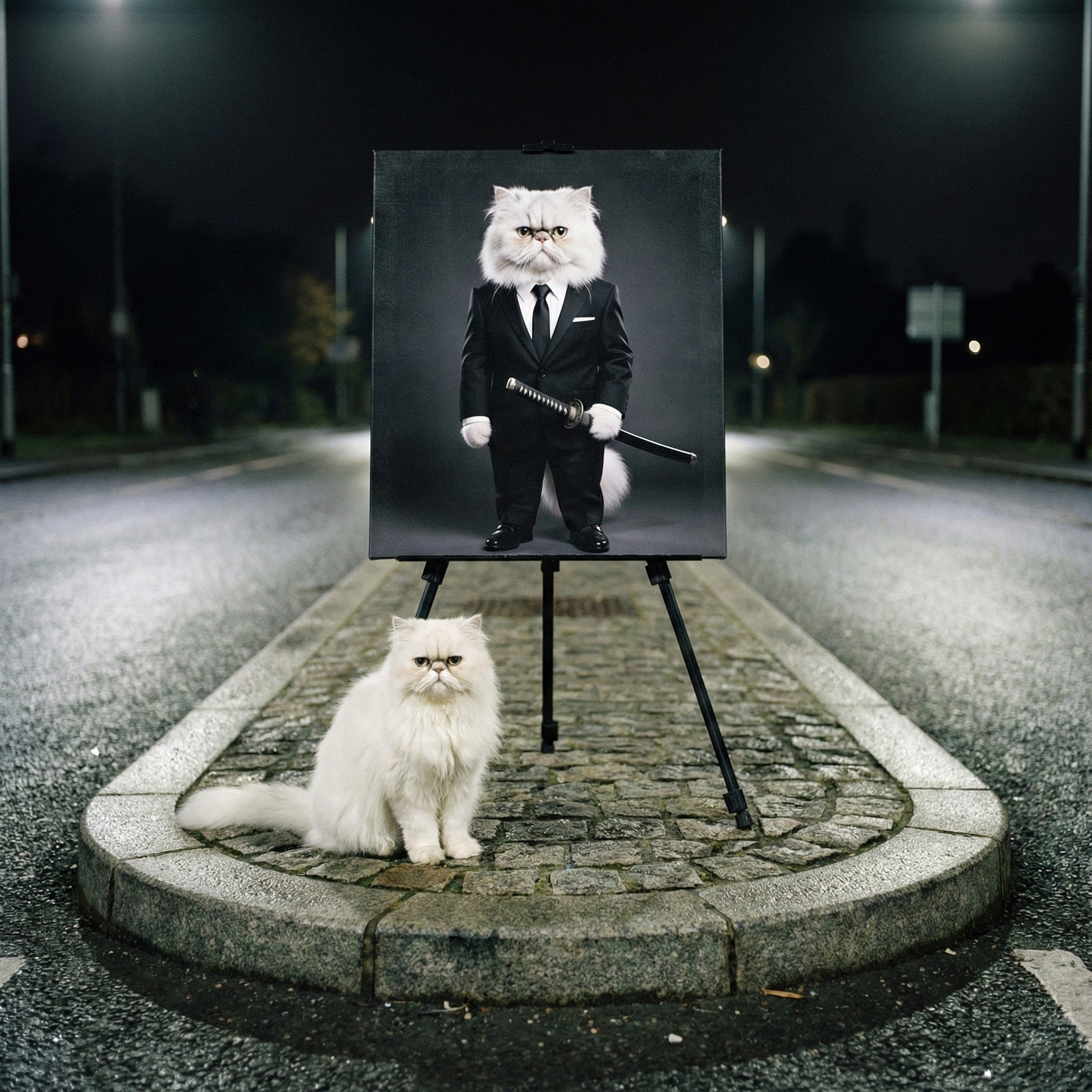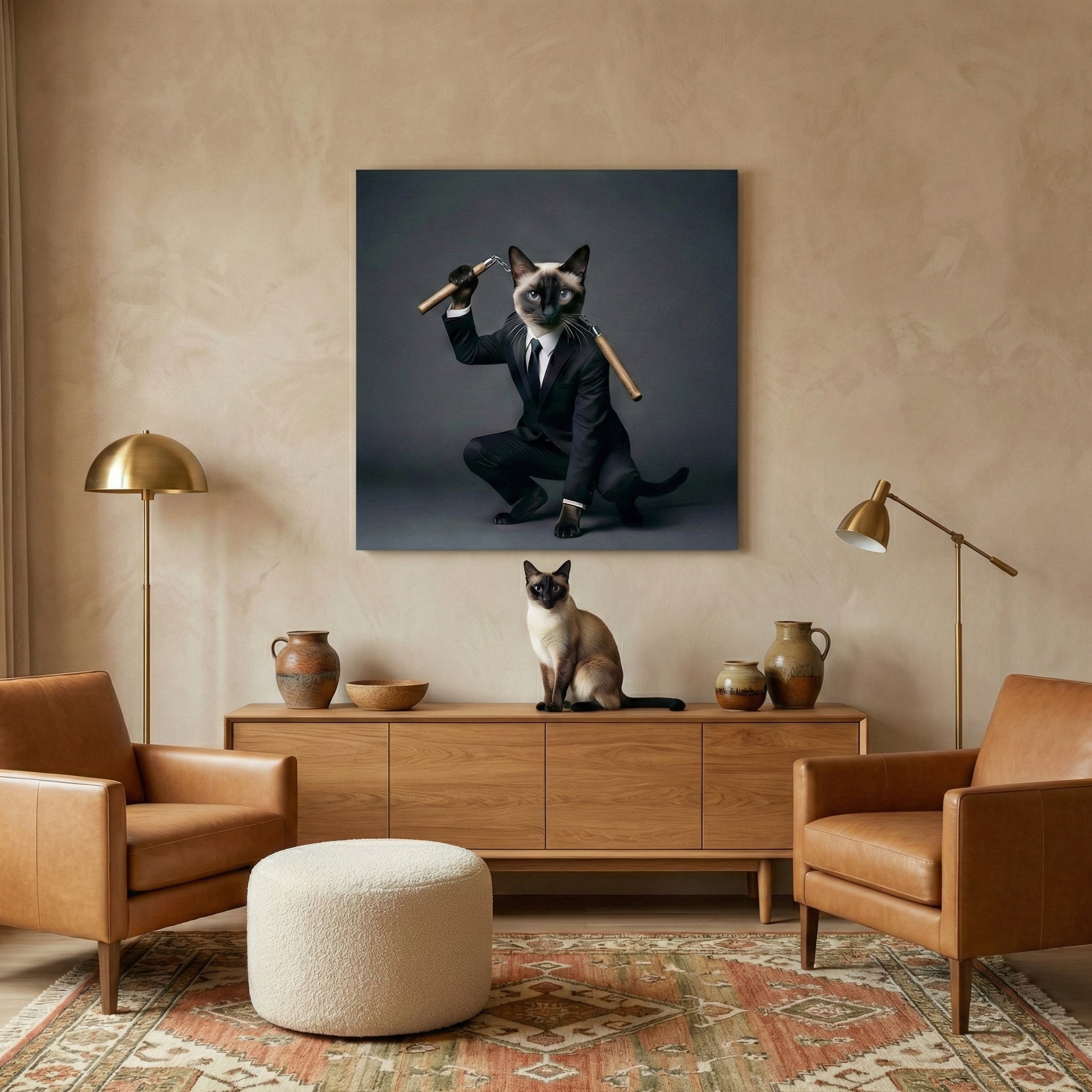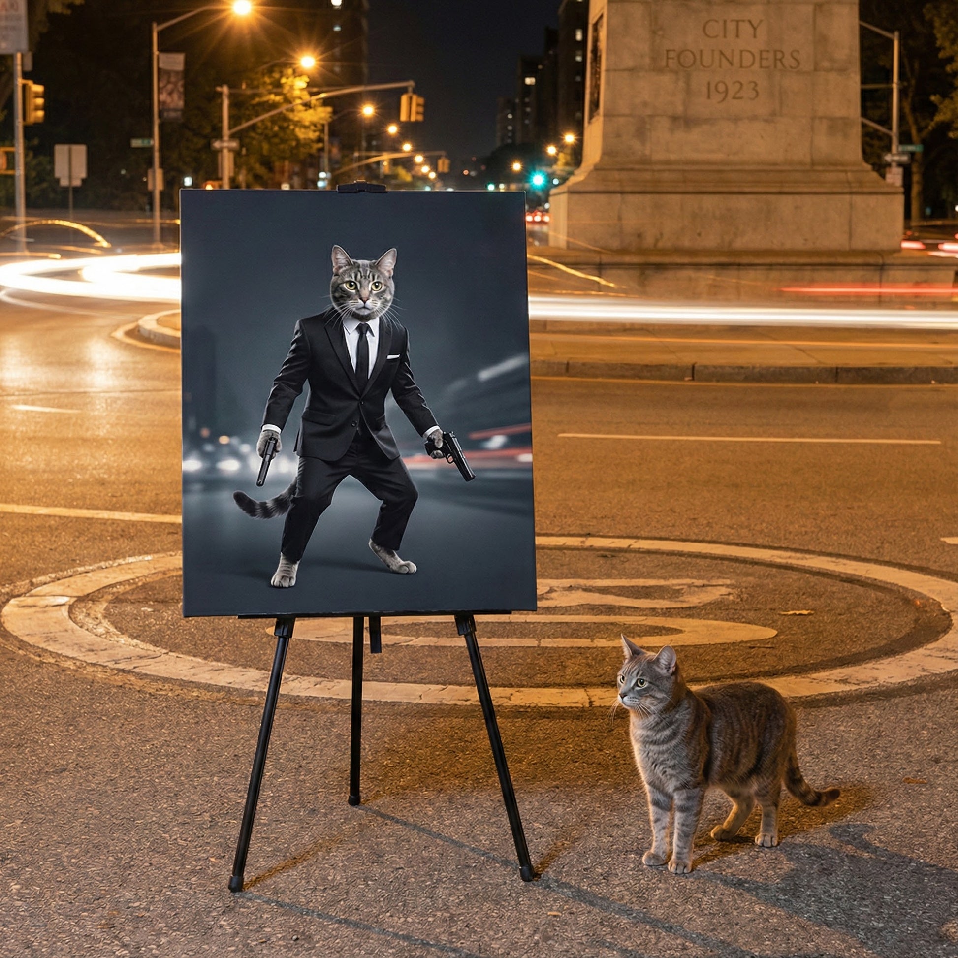 This canvas reimagines your cat as a sharp, cinematic character set in a dark, high-contrast world. Tailored suits, dramatic lighting, and a minimalist palette give the image a sleek, confident presence that feels bold without being over the top.