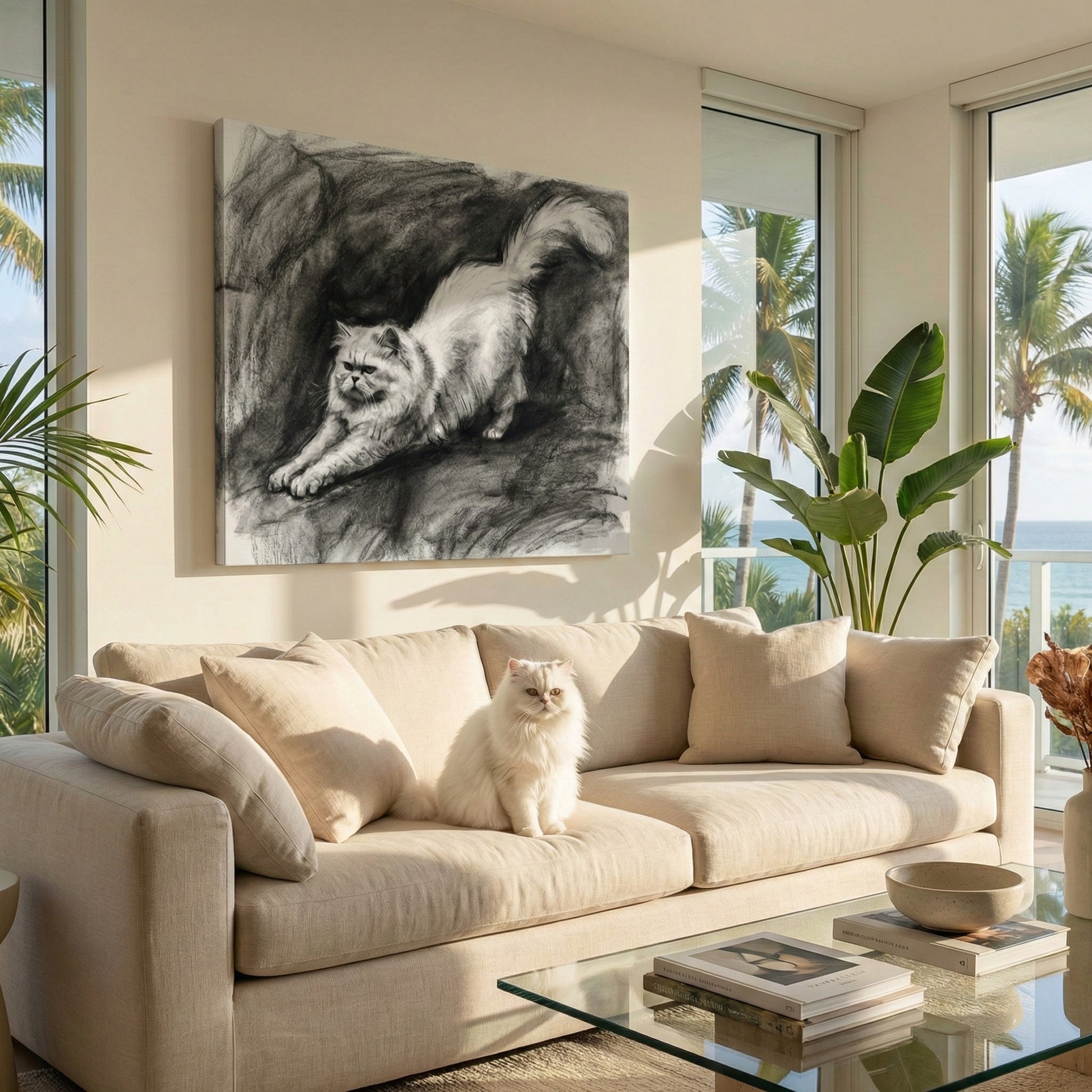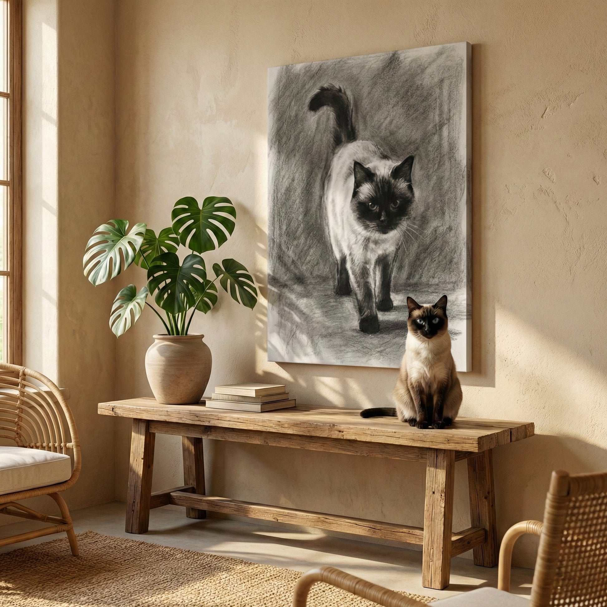 The result feels calm and refined, blending easily into classic, rustic, or modern interiors. This style works especially well for cats with expressive eyes, strong markings, or relaxed poses, creating a portrait that feels thoughtful and understated rather than decorative.