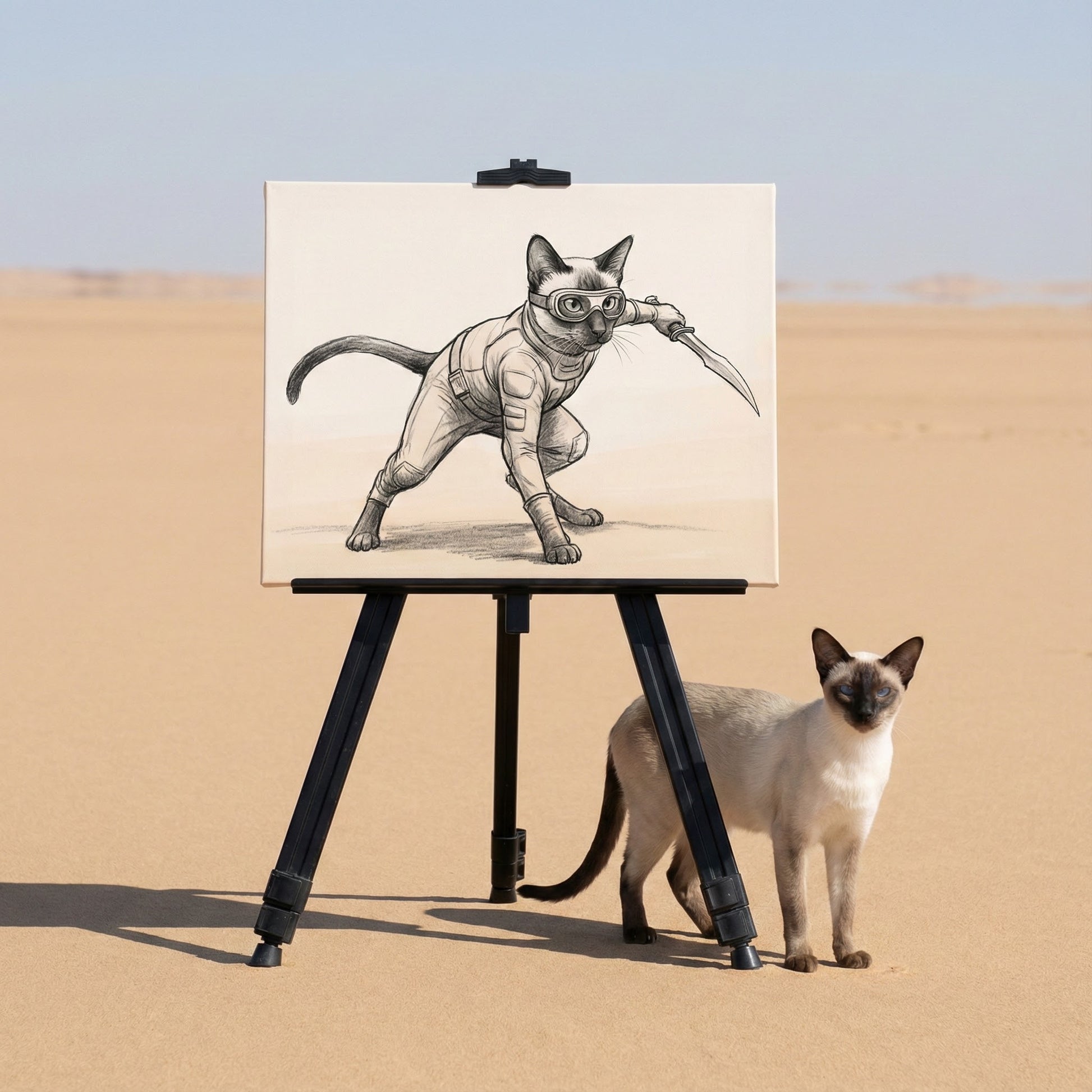 This canvas transforms your cat into a bold, illustrated character set against a stark desert backdrop. Clean linework, muted earth tones, and graphic shading give the piece a cinematic, story-driven feel—more graphic novel than traditional pet portrait.